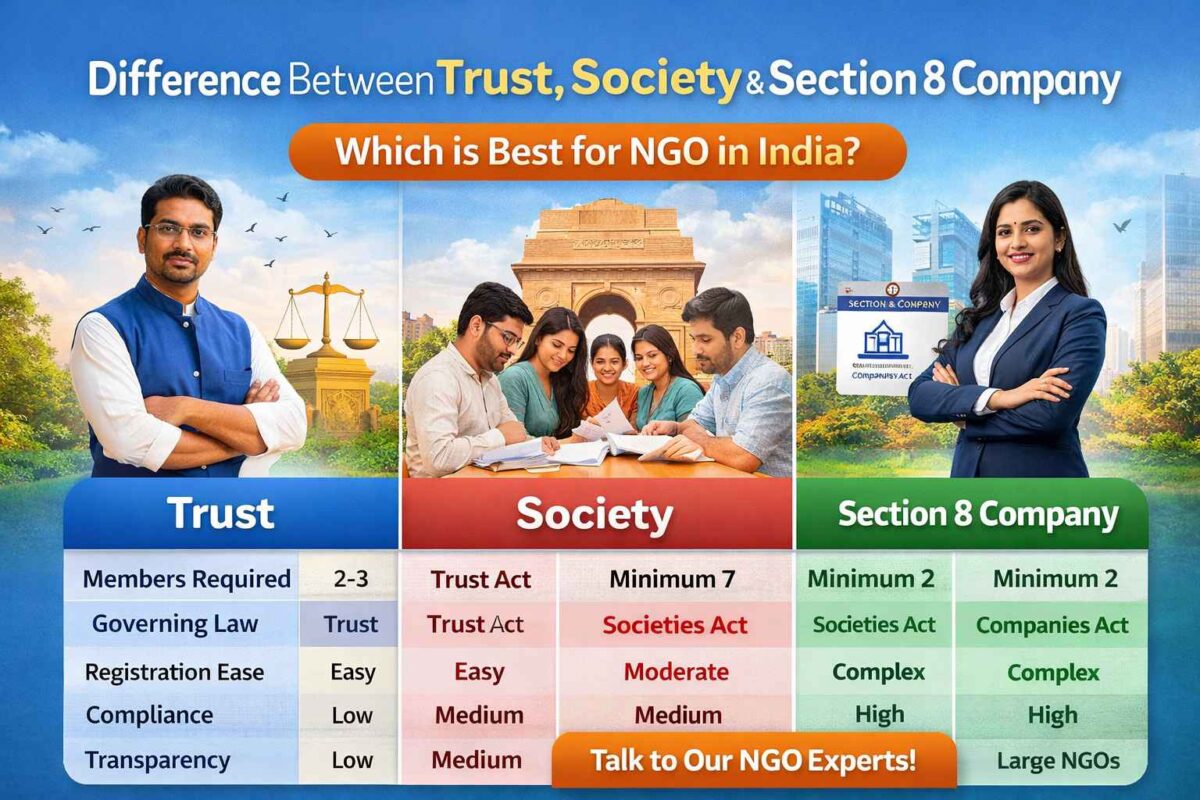 25 Mar Ngo Advisory Difference Between Trust, Society & Section 8 Company – Which is Best for NGO in India? Posted by tosmratitiwari17@gmail.com March 25, 2026 0 Difference Between Trust, Society & Section 8 Company – Which is Best for NGO in India? Starting a Non-Governmental Organization... Continue reading